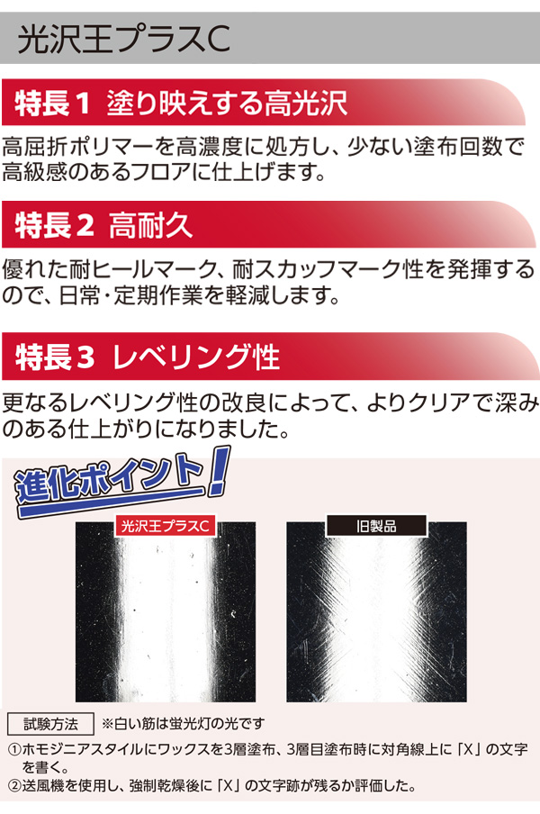 「光沢王プラスC」は、塗り映えのある高光沢仕上げと優れた耐久性を兼ね備えた業務用床用樹脂仕上剤です。